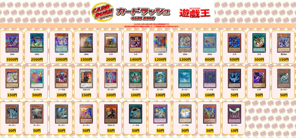 #遊戯王 買取情報 ジェムナイトネピリム 25th ¥3500 光の黄金櫃 25th ¥2500 覇王門の魔術師 25th ¥2000 巨大戦艦ブラスターキャノンコア 20th ¥1500 巨大戦艦ブラスターキャノンコア シク ¥200 紅涙の魔ラクリモーサ シク ¥1400 混沌の黒魔術師 25th ¥1200 天威龍スールヤ 25th ¥1200 化石調査 25th ¥600 アルカナフォースXVTHEDEVIL シク ¥500 緊急テレポート シク ¥300 [新]未界域のビッグフット(青) 25th ¥150 マナドゥムリウムハート シク ¥150 手札抹殺 スーパー ¥300 ワイトベイキング ノーマル ¥200 クリムゾンブレーダー ウルトラ ¥150 電磁石の戦士α スーパー ¥100 電磁石の戦士β スーパー ¥100 電磁石の戦士γ スーパー ¥100 RRコール スーパー ¥100 闇のデッキ破壊ウイルス ノーパラ ¥100 ウォータードラゴンクラスター ウルトラ ¥50 悦楽の堕天使 レア ¥50 巨大戦艦カバードコア スーパー ¥50 巨大戦艦クリスタルコア スーパー ¥50 巨大戦艦テトラン スーパー ¥50 巨大戦艦ビッグコアMkIII スーパー ¥50 巨大戦艦ブラスターキャノンコア スーパー ¥50 黒き魔術師ブラックマジシャン ウルトラ ¥50 苦渋の決断 ノーマル ¥50 マグネットコンバージョン ノーパラ ¥50 ヘカテリス ノーマル ¥30 捕食植物ヘリアンフォリンクス スーパー ¥30 マグネットフォース スーパー ¥10