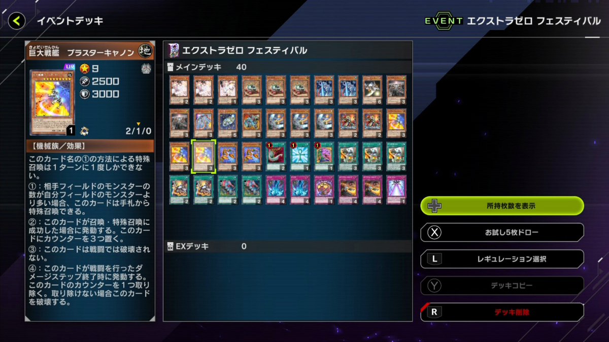 思い返せばマスターデュエル始めて3番目くらいに作ったデッキは巨大戦艦だったな。当時はスキルドレインもサモンリミッターも無制限だったからメタビみたいな感じでそこそこやれた思い出。テラフォも生きてたから巨大要塞ゼロスも実質4枚体制みたいなとこあったし