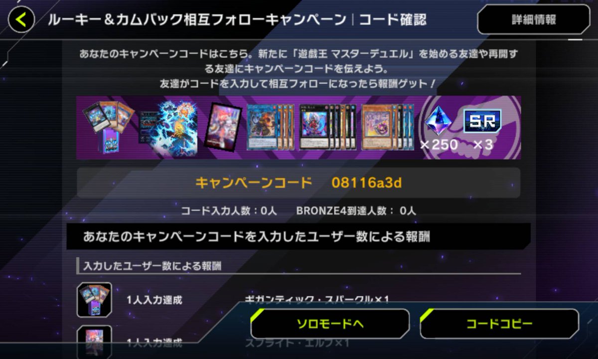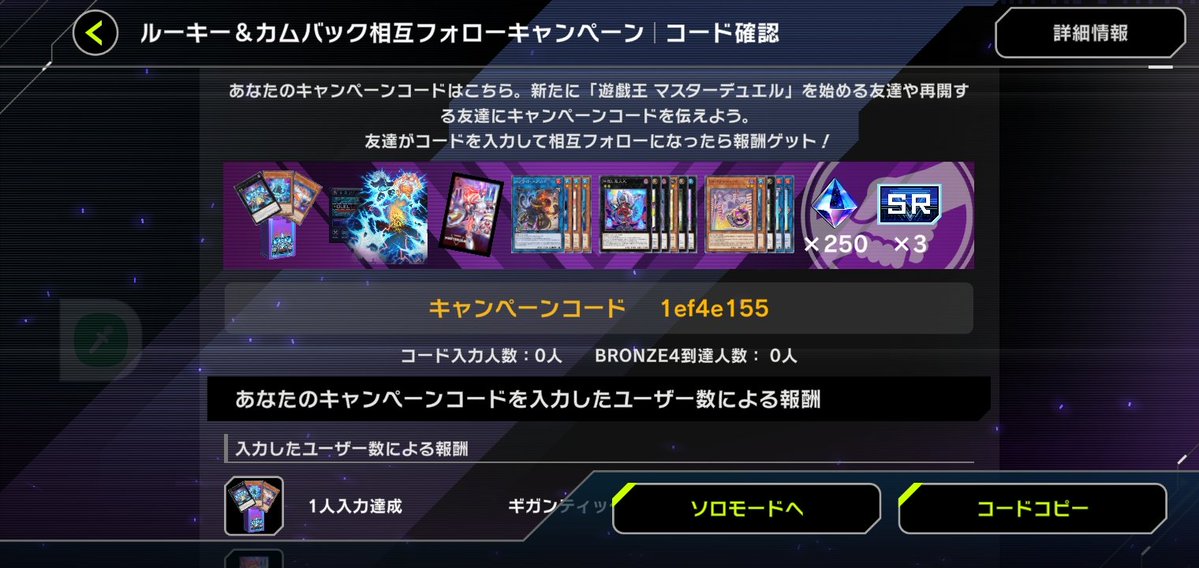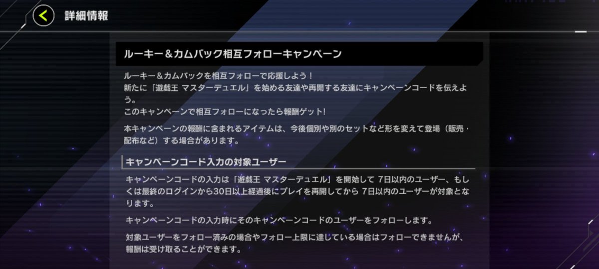 曜ちゃん2号@YOU_CHAN_2GOU今年のルーキー&カムバックキャンペーンです。 よろしくお願いします。 今から始める方、久しぶりにやりたくなった方是非とも活用してください。 ※注意 コードだけ入力してフォローを外したりする方はお断りします。 08116a3d #遊戯王 #マスターデュエル #カムバックキャンペーン pic.x.com/SVyqfSw2i4