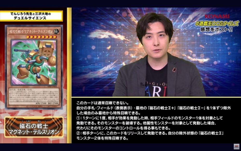 @sinjuusiyou 三沢の使ってた磁石の戦士がOCG化されるからその宣伝で、三沢といえば化学って事ででんじろう先生呼んで三沢と実験する配信が昨日公式からあがってた