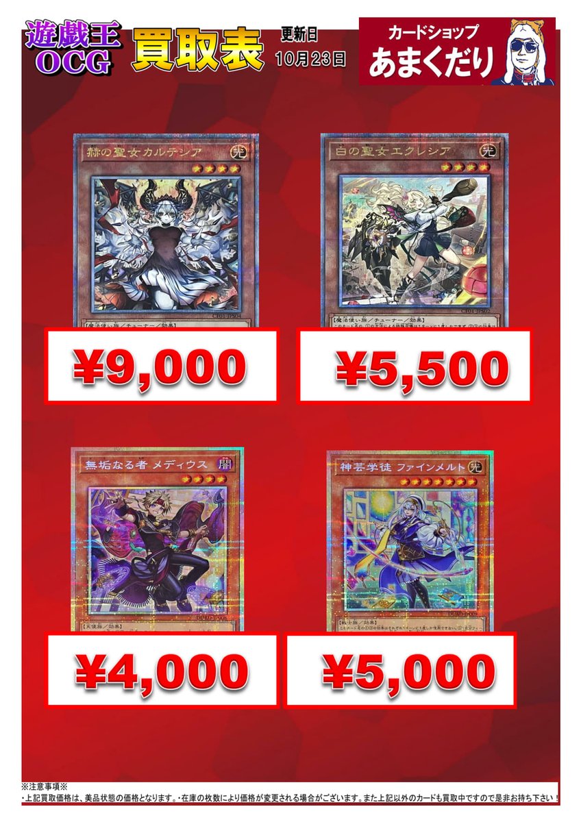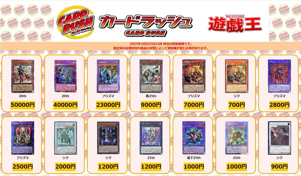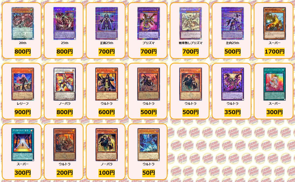 カードラッシュ遊戯王@cardrush_yugioh#遊戯王 買取情報 閃刀姫ロゼ 20th ¥50000 青眼の究極亜竜 20th ¥40000 究極竜騎士 プリズマ ¥23000 (新)白の聖女エクレシア 25th ¥9000 白の聖女エクレシア プリズマ ¥7000 白の聖女エクレシア シク ¥700 デスピアンクエリティス プリズマ ¥2800 灰燼竜バスタード プリズマ ¥2500 氷結界の虎王ドゥローレン シク ¥2000 堕天使イシュタム シク ¥1200 宵星の機神ディンギルス 25th ¥1200 エルシャドールミドラーシュ(竜下) 25th ¥1000 幻獣王キマイラ 25th ¥1000 レッドデーモンズドラゴンスカーライト シク ¥900 魔妖仙獣独眼群主 20th ¥800 幻獣魔王バフォメット 25th ¥800 エルシャドールネフィリム(正面) 25th ¥700 スターヴヴェノムプレデターフュージョンドラゴン プリズマ ¥700 [新]召喚獣メルカバー(戦車無し) プリズマ ¥700 [新]エルシャドールネフィリム(左向) 25th ¥500 霞の谷の巨神鳥 スーパー ¥1700 エクソシスターマルファ レリーフ ¥900 トライエッジマスター ノーパラ ¥800 刻印を持つ者 ウルトラ ¥600 スプリガンズキット(ロゴ) ウルトラ ¥500 軒轅の相剣師(ロゴ) ウルトラ ¥500 聖神蛇アポピス ウルトラ ¥350 ピュアリィマイフレンド スーパー ¥300 王の遺宝祀りし聖域 スーパー ¥300 白の聖女エクレシア(ロゴ) ウルトラ ¥200 軒轅の相剣師 ノーパラ ¥100 幻魔皇ラビエル天界蹂躙拳 ウルトラ ¥50