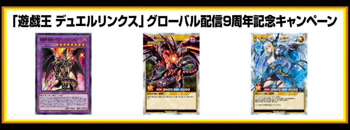 グローバル配信9周年キャンペーン中にデュエルリンクスにログインすると、「超魔導竜騎士-ドラグーン・オブ・レッドアイズ」に加え、ラッシュデュエル版の 「真紅眼の黒竜」と、デュエルリンクス9周年記念カード「ディメンション・リンカー」がゲットできます!