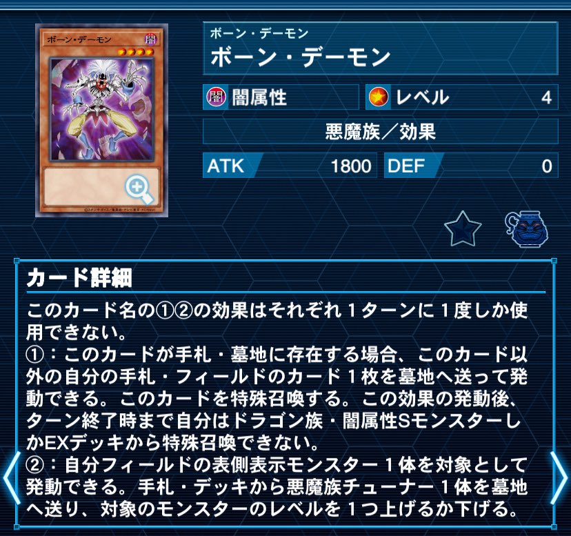 諧謔をセットの発動→ボーンを特殊召喚し、 ボーン効果でヴィジョン墓地送りの発動、ヘルガイア加えれる。 レッド・デーモン新規です