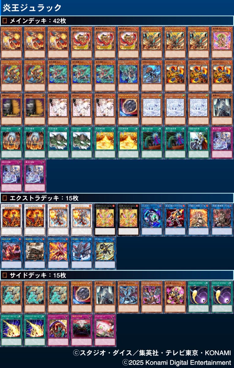 @49HYwF0g8u4uTZF 自分も組んだばっかなので理解度低いんですが、簡単に言うと炎王の動きにジュラックメテオ決めるギミックを足しただけですね。ガルドで炎王獣キリン破壊したらミセラ落としてメガロ出せるので、炎王しか引かなくてもジュラックの動きができるようにしてるらしいです。