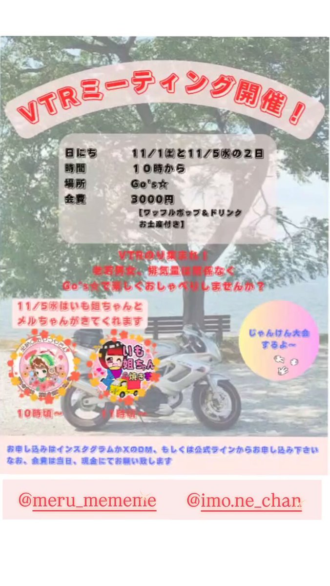 VTRミーティング! 11/5㈬はいも姐ちゃん(11時頃)と メルちゃん(10時頃)も来てくれます。 楽しいミーティングになりそうです @imo_ne_chan #ゴーズ #キャンプ #VTR #VTRミーティング pic.x.com/Dh7tUZHRj0