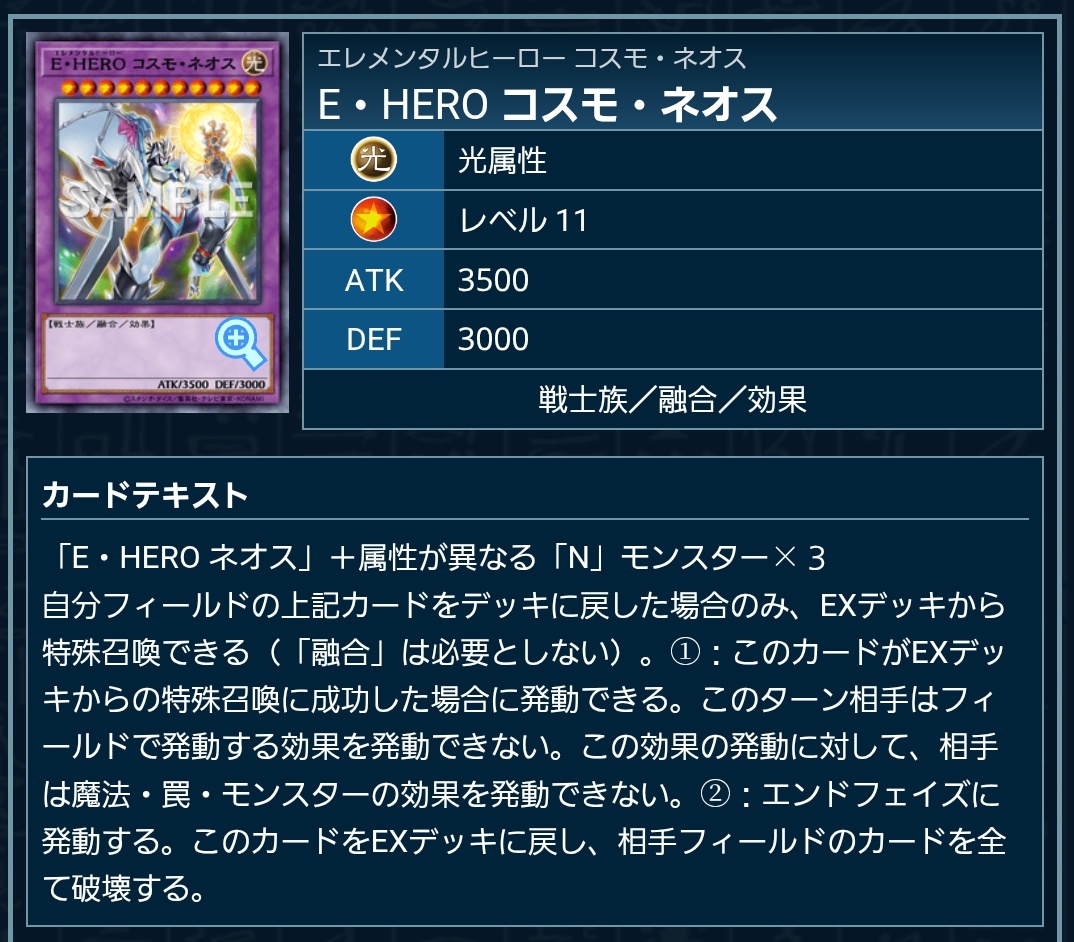 ↓条件 ・光属性 ・レベル7 ・戦士族 ・攻撃力2500守備力2000 ・ネオスペースからやってきた新たなるE・HERO。 ネオスペーシアンとコンタクト融合する事で、未知なる力を発揮する!