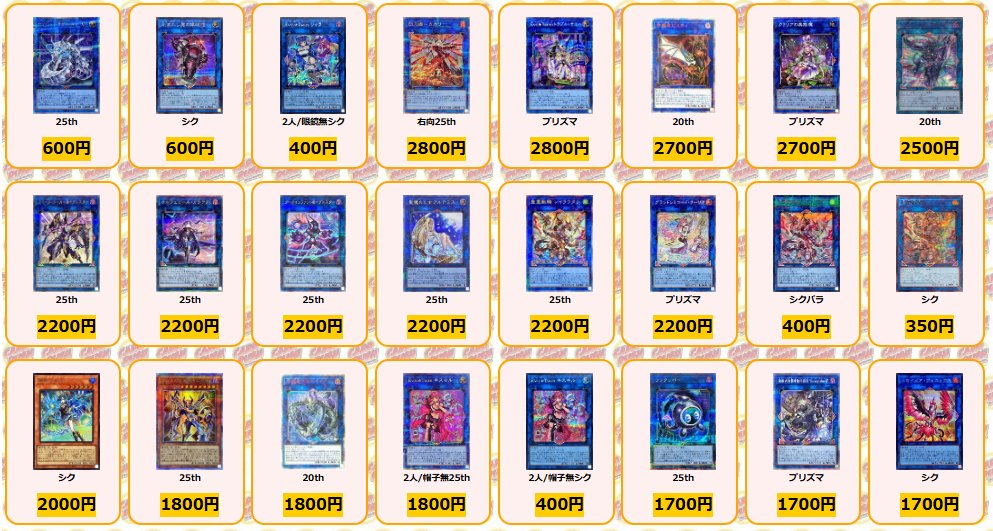 カードラッシュ遊戯王@cardrush_yugioh#遊戯王 買取情報 閃刀姫カイナ 20th ¥23000 SPリトルナイト 25th ¥17000 星辰砲手ファイメナ プリズマ ¥12000 超魔導竜騎士ドラグーンオブレッドアイズ 20th ¥12000 耀聖の花詩ルキナ プリズマ ¥7500 幽鬼うさぎ 20th ¥5500 (新)水霊使いエリア シク ¥5500 (新)風霊使いウィン シク ¥5500 [新]IPマスカレーナ(バイク有) 25th ¥4800 [新]IPマスカレーナ(バイク有) シク ¥300 鉄獣戦線徒花のフェリジット プリズマ ¥4500 鉄獣戦線徒花のフェリジット シク ¥500 灼熱の火霊使いヒータ 25th ¥4200 [新]閃刀姫シズク(バリア) 25th ¥3700 [新]閃刀姫シズク(バリア) シク ¥400 [新]閃刀姫ハヤテ(剣/ロゼ) 25th ¥3500 閉ザサレシ世界ノ冥神 プリズマ ¥3500 閉ザサレシ世界ノ冥神 25th ¥3200 [新]閃刀姫ハヤテ(剣/ロゼ) シク ¥400 失楽の堕天使 シク ¥3200 サイバードラゴンズィーガー 20th ¥3000 [新]EvilTwinリィラ(2人/眼鏡無) 25th ¥3000 刻まれし魔の鎮魂棺 25th ¥3000 照耀の光霊使いライナ 25th ¥3000 サイバードラゴンズィーガー 25th ¥600 刻まれし魔の鎮魂棺 シク ¥600 [新]EvilTwinリィラ(2人/眼鏡無) シク ¥400 [新]閃刀姫カガリ(右向) 25th ¥2800 EvilTwin’sトラブルサニー プリズマ ¥2800 守護竜ピスティ 20th ¥2700 クラリアの蟲惑魔 プリズマ ¥2700 ジアライバルサイバース@イグニスター 20th ¥2500 アコードトーカー@イグニスター 25th ¥2200 オルフェゴールガラテアi 25th ¥2200 ダークインファント@イグニスター 25th ¥2200 聖魔の乙女アルテミス 25th ¥2200 聖霊獣騎レイラウタリ 25th ¥2200 グランドレミコードクーリア プリズマ ¥2200 聖霊獣騎レイラウタリ シクパラ ¥400 聖霊獣騎レイラウタリ シク ¥350 耀聖の波詩ディーナ シク ¥2000 ホルスの栄光イムセティ 25th ¥1800 守護竜アガーペイン 20th ¥1800 [新]EvilTwinキスキル(2人/帽子無) 25th ¥1800 [新]EvilTwinキスキル(2人/帽子無) シク ¥400 リンクリボー 25th ¥1700 鉄獣式強襲機動兵装改BucephalusII プリズマ ¥1700 トロイメアフェニックス シク ¥1700 奇跡の魔導剣士 25th ¥1500 ヴァルモニカの神奏ヴァーラル 25th ¥1400 XHEROクロスガイ 25th ¥1300 XHEROワンダードライバー 25th ¥1300 巳剣之尊麁正 シク ¥1200 EHEROシャイニングネオスウィングマン 25th ¥1200 アロマリリスローズマリー 25th ¥1200 破械神王ヤマ 25th ¥1200 [新]召命の神弓アポロウーサ(月下) プリズマ ¥1200 トロイメアグリフォン シク ¥1200 破械神王ヤマ シク ¥400 XHEROヘルデバイサー 25th ¥1100 アロマセラフィジャスミン 25th ¥1100 ヘビーメタルフォーゼエレクトラム 25th ¥1100 神聖魔皇后セレーネ 25th ¥1100 天球の聖刻印 25th ¥1100 魔界特派員デスキャスター プリズマ ¥1100 機巧嘴八咫御先 20th ¥1000 EHEROネオスクルーガー 20th ¥1000 ライトロードドミニオンキュリオス 25th ¥1000 転生炎獣アルミラージ 25th ¥1000 ヴァレルエンドドラゴン 25th ¥900 青き眼の精霊 シク ¥900 機巧蹄天迦久御雷 20th ¥800 リンクメイルデーモン 20th ¥700 閃刀姫カガリ(左向) 25th ¥600 プロテクトコードトーカー プリズマ ¥600 転生炎獣レイジングフェニックス シク ¥600 六武衆の軍大将 シク ¥600 世海龍ジーランティス プリズマ ¥500 LGD シク ¥500 賜炎の咎姫 シク ¥500 鉄獣戦線凶鳥のシュライグ シク ¥500 デコードトーカーヒートソウル 25th ¥400 海晶乙女グレートバブルリーフ シク ¥400 聖霊獣騎キムンファルコス シク ¥400 トゥリスヴァレルドラゴン シク ¥350 デリンジャラスドラゴン 25th ¥300 トロイメアユニコーン 25th ¥200 スケアクロートライヒハート プリズマ ¥200 機械仕掛けの騎士 シク ¥200 次元障壁 シク ¥100