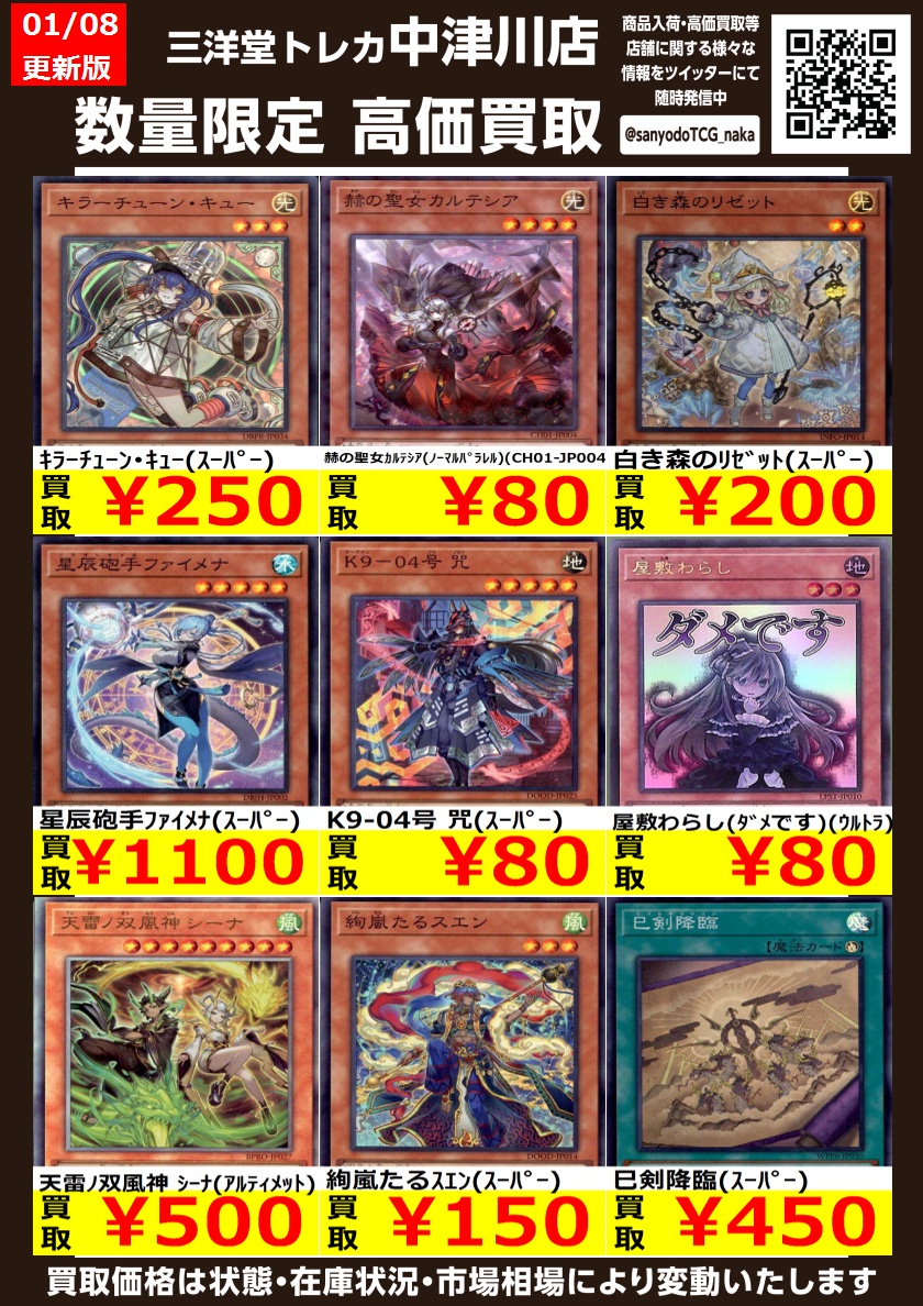 おたちゅう。秋葉原5号店GO!GO!トレカ@otachu_akiba0遊戯王買取情報 プリシク買取募集中! 無垢なる者メディウス ¥6000 神芸学徒ファインメルト ¥4500 閃刀姫ゼロ ¥30000 星辰砲手ファイメナ ¥11000 キラーチューン・レッドシール ¥7500 PSEC-JP001 青眼の白龍(未開封) ¥125000 買取表はコチラ⇓ otachu-akiba.com/1gocard/buying… pic.x.com/CMsABUCnw6