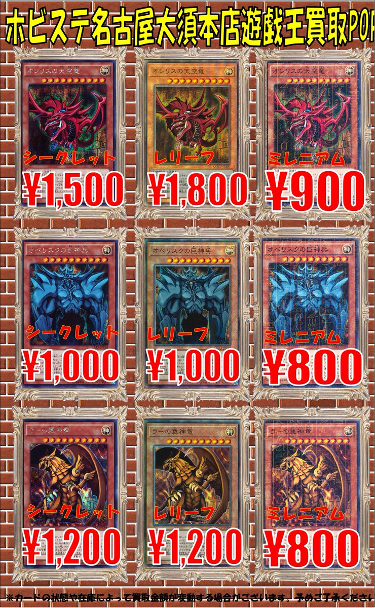 ホビステ名古屋大須本店@hbst_nagoya【遊戯王買取速報】 神関連! オシリスの天空竜 シークレット1500/レリーフ1800/ミレニアム900円 オベリスクの巨神兵 シークレット1000/レリーフ1000/ミレニアム800円 ラーの翼神竜 シークレット1200/レリーフ1200/ミレニアム800円 買取募集! まだまだまだ続く #遊戯王 #遊戯王OCG pic.x.com/SVeuQZSsIB