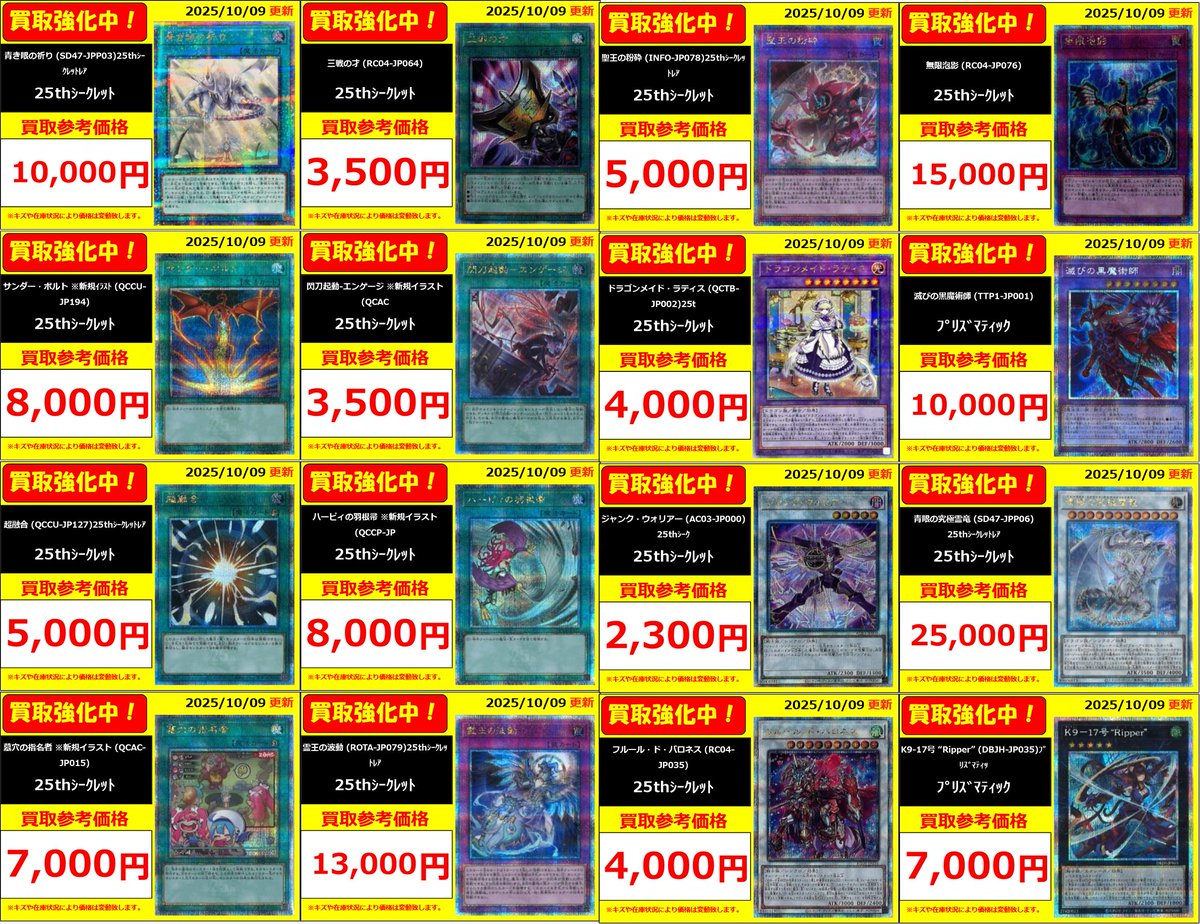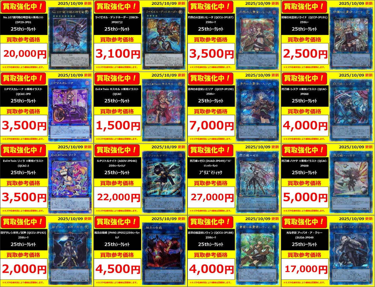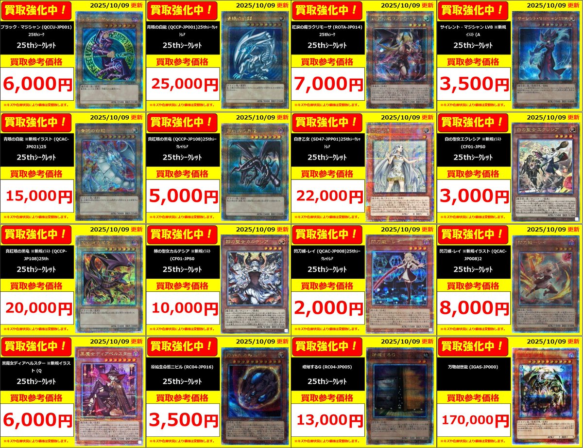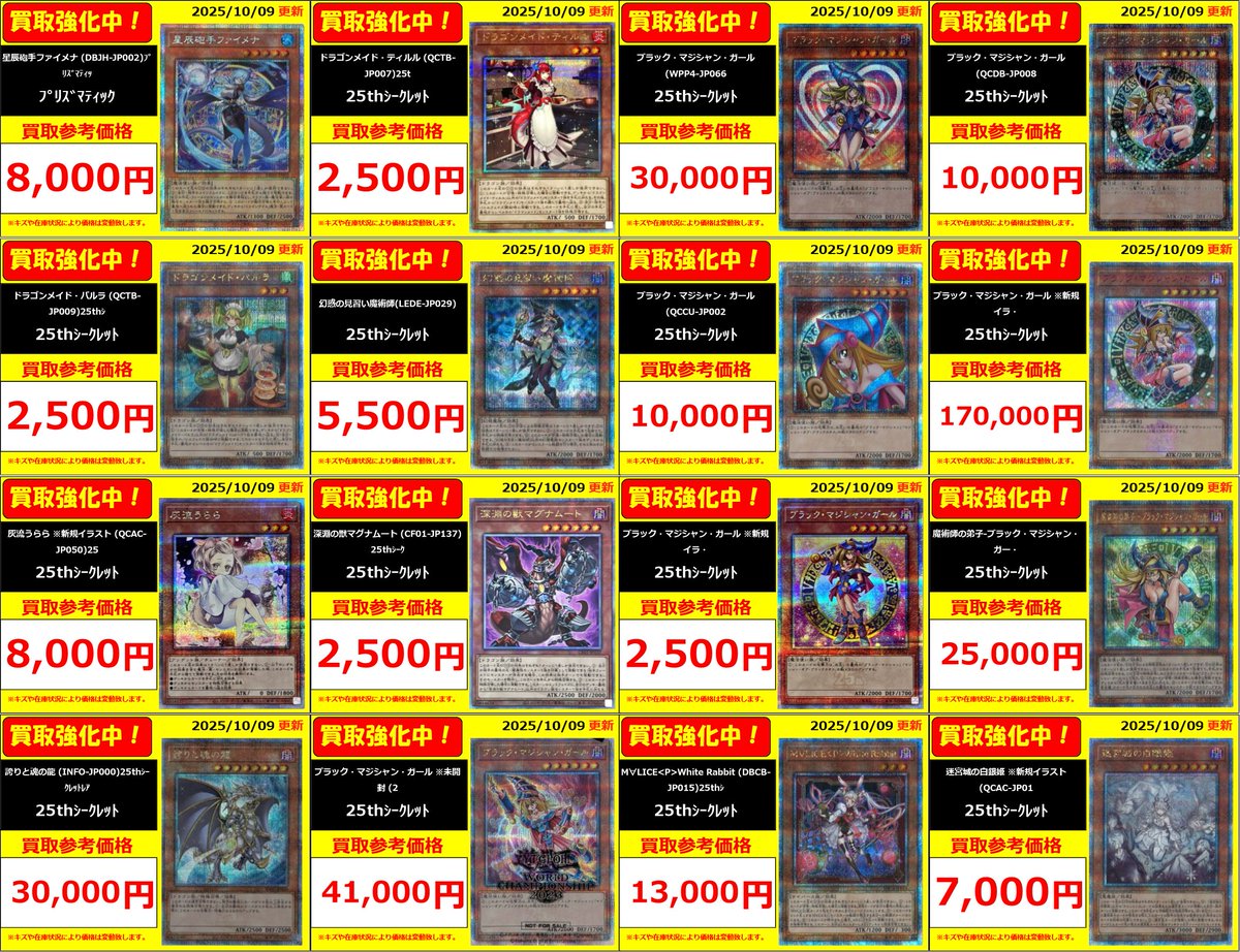 【#遊戯王 買取情報】 10/12 ブラック・マジシャン/ 25th:7500 ブラック・マジシャン※新規イラスト/ 25th:5000 青眼の白龍/ 25th:32000 青眼の白龍※新規イラスト/ 25th:10000 真紅眼の黒竜※新規イラスト/ 25th:21000 赫の聖女カルテシア※新規イラスト/ 25th:8000 エフェクト・ヴェーラー/ 25th:3000 エフェクト・ヴェーラー※新規イラスト/ 25th:1700 黒魔女ディアベルスター/ 25th:6000 黒魔女ディアベルスター※新規イラスト/ 25th:5000 原罪のディアベルゼ/ 25th:3000 原始生命態ニビル/ 25th:3000 原始生命態ニビル※新規イラスト/ 25th:2000 紅涙の魔ラクリモーサ/ 25th:9000 白き乙女/ 25th:23000 白き森の聖徒リゼット/ 25th:3500 白き森のアステーリャ/ 25th:3000 白き森のリゼット/ 25th:5500 白の聖女エクレシア※新規イラスト/ 25th:4000 重騎士プリメラ/ 25th:10000 閃刀姫-レイ/ 25th:2500 閃刀姫-レイ※新規イラスト/ 25th:7500 増殖するG/ 25th:16000 幻惑の見習い魔術師/ 25th:6000 灰流うらら/ 25th:9000 灰流うらら※新規イラスト/ 25th:10000 深淵の獣マグナムート/ 25th:2000 魔轟神ルリー/ 25th:7000 魔術師の弟子-ブラック・マジシャン・ガール/ 25th:30000 M∀LICE<P>WhiteRabbit/ 25th:15000 白銀の城の執事アリアス/ 25th:5000 迷宮城の白銀姫※新規イラスト/ 25th:6000 超魔導竜騎士-ドラグーン・オブ・レッドアイズ/ 25th:2800 究極竜魔導師/ 25th:5000 赤き竜/ 25th:4000 カオス・アンヘル-混沌の双翼-/ 25th:4500 シューティング・クェーサー・ドラゴン/ 25th:8000 氷結界の龍トリシューラ/ 25th:3400 青眼の究極霊竜/ 25th:27000 青眼の精霊龍/ 25th:4500 フルール・ド・バロネス/ 25th:5000 神影金龍ドラッグルクシオン/ 25th:3200 No.107銀河眼の時空竜※新規イラスト/ 25th:26000 天霆號アーゼウス/ 25th:2200 天霆號アーゼウス※新規イラスト/ 25th:1700 ライゼオル・デッドネーダー/ 25th:3200 厄災の星ティ・フォン/ 25th:7000 I:Pマスカレーナ/ 25th:4000 I:Pマスカレーナ※新規イラスト/ 25th:4000 アクセスコード・トーカー/ 25th:1800 Evil★Twinリィラ※新規イラスト/ 25th:3000 S:Pリトルナイト/ 25th:22000 閉ザサレシ世界ノ冥神/ 25th:2000 賜炎の咎姫/ 25th:6000 閃刀姫-カガリ※新規イラスト/ 25th:3000 閃刀姫-シズク※新規イラスト/ 25th:4200 閃刀姫-ハヤテ※新規イラスト/ 25th:4000 刻まれし魔の鎮魂棺/ 25th:1900 光なき影ア=バオ・ア・クゥー/ 25th:17000 青き眼の祈り/ 25th:14000 ヴァルモニカ・シェルタ/ 25th:7500 禁じられた一滴/ 25th:5500 三戦の号/ 25th:3200 三戦の才/ 25th:3500 サンダー・ボルト※新規イラスト/ 25th:9000 閃刀起動-エンゲージ※新規イラスト/ 25th:3300 増援/ ART1/:3000 超融合/ 25th:5000 調律※新規イラスト/ 25th:5500 ハーピィの羽根帚※新規イラスト/ 25th:12000 墓穴の指名者/ 25th:5000 墓穴の指名者※新規イラスト/ 25th:8000 ヒーローアライブ/ 25th:4800 封印の黄金櫃/ 25th:2200 抹殺の指名者/ 25th:5000 烙印融合/ 25th:4000 拮抗勝負/ 25th:3500 霊王の波動/ 25th:15000 聖王の粉砕/ 25th:7000 無限泡影/ 25th:16000 #フルコンプ秋葉原店