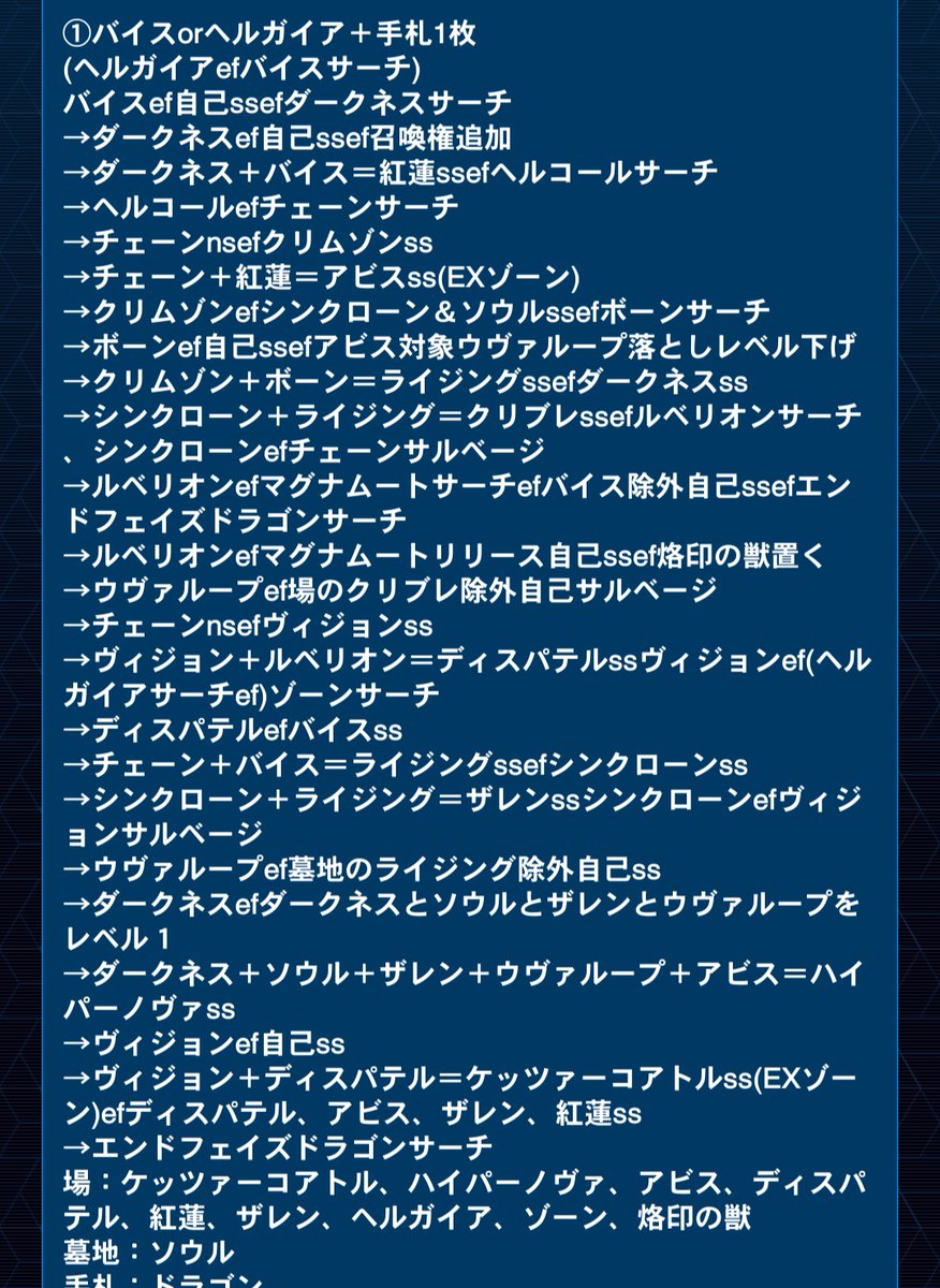 御導はるか@決闘者@midouharuka_ypバイス1枚初動ボーン使ってないので手札コストもなし 1枚目はライジングでハイパー、ヘルガイアでゾーンサーチした場合 2枚目はライジングをブレードにした後ハイパー、ヘルガイアでヴィジョンサーチ、相手ターン赤き竜でアビス蘇生って感じ pic.x.com/rU6v6tha2Q