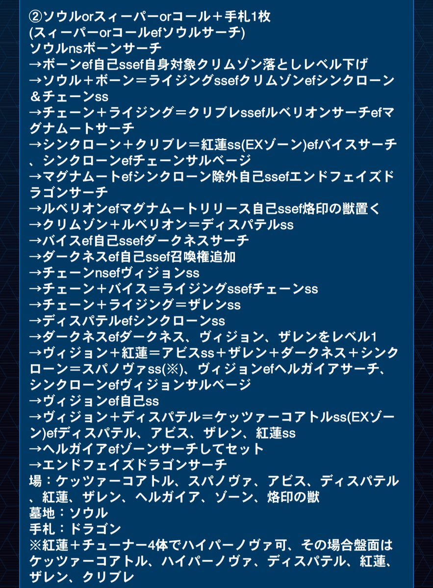 ノビ@debri415レッド・デーモン展開 構築歪まない範囲ならおそらくこれが最適解 ①パワーバイス初動 場:ケッツァーコアトル、ハイパーノヴァ、アビス、紅蓮、ディスパテル、ザレン ヘルガイア、ゾーン、烙印の獣 墓地:ソウル ツィオルキン→ケッツァーコアトル カラミティ→ハイパーノヴァ スカーライト→紅蓮 pic.x.com/G4dAg2p36O