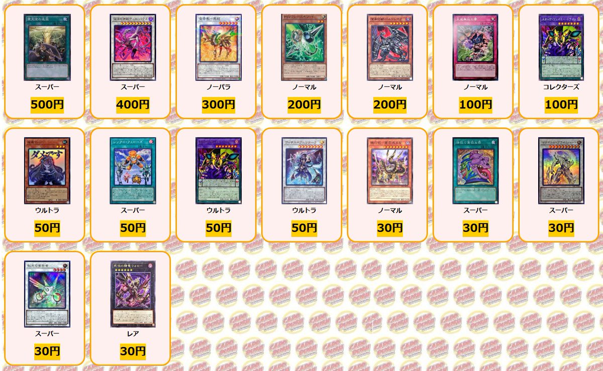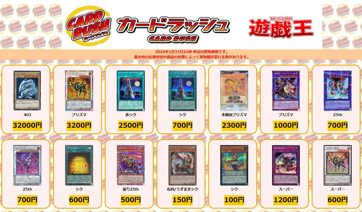 カードラッシュ遊戯王@cardrush_yugioh#遊戯王 買取情報 青眼の白龍 ホロ ¥32000 金雲獣馬龍 プリズマ ¥3200 エンディミオン皇国 赤シク ¥2500 エンディミオン皇国 シク ¥700 (未開封)ラーの翼神竜 プリズマ ¥2300 超魔導師ブラックマジシャンズ プリズマ ¥1000 サイバーエンドドラゴン 25th ¥700 深淵の神獣ディスパテル 25th ¥700 千年の啓示 シク ¥600 [新]黄金卿エルドリッチ(座り) 25th ¥500 [新]幽鬼うさぎ(右向/うずまき) シク ¥150 ペンデュラムウィッチ シク ¥100 聖王の粉砕 スーパー ¥1200 金雲獣馬龍 スーパー ¥600 堕天使の追放 スーパー ¥500 深淵の神獣ディスパテル スーパー ¥400 金雲獣馬龍 ノーパラ ¥300 PSYフレームギアγ ノーマル ¥200 深淵の獣バルドレイク ノーマル ¥200 天威無双の拳 ノーマル ¥100 スターヴヴェネミードラゴン コレクターズ ¥100 屋敷わらし ウルトラ ¥50 シンクロフェローズ スーパー ¥50 スターヴヴェネミードラゴン ウルトラ ¥50 ヴィサス=アムリターラ ウルトラ ¥50 機巧蛇叢雲遠呂智 ノーマル ¥30 強欲で貪欲な壺 スーパー ¥30 マナドゥムプライムハート スーパー ¥30 虹光の宣告者 スーパー ¥30 死祖の隷竜ウォロー レア ¥30