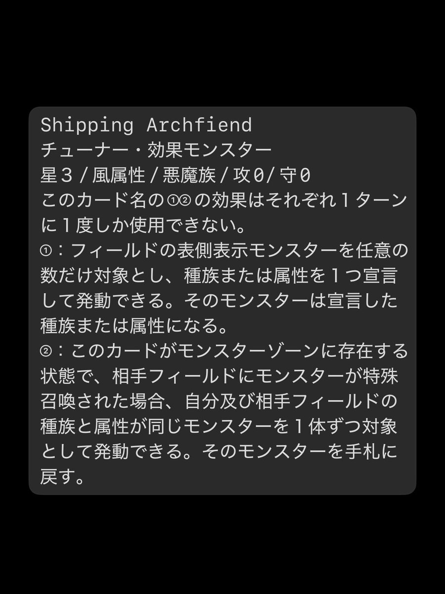 シロクリボー@shirokuriboh「Shipping Archfiend」 海外先行の「デーモン」モンスター フィールドのモンスターの属性か種族をまとめて永続的に変更するユニークな効果を持ち、自身を光属性に変更すればデモンスミスにも繋がる 片方しか変更できないので②の妨害効果を狙えるかは状況に左右される pic.x.com/2IcBySLXEb