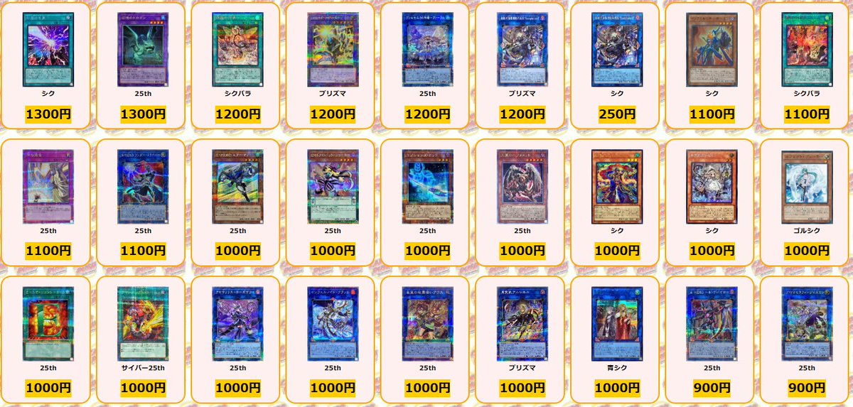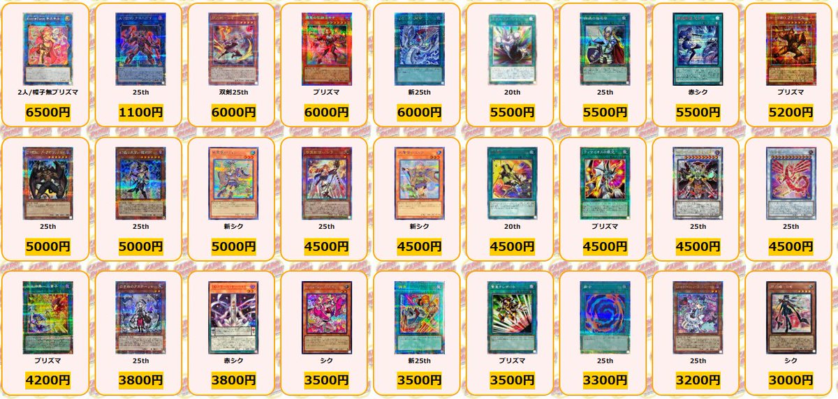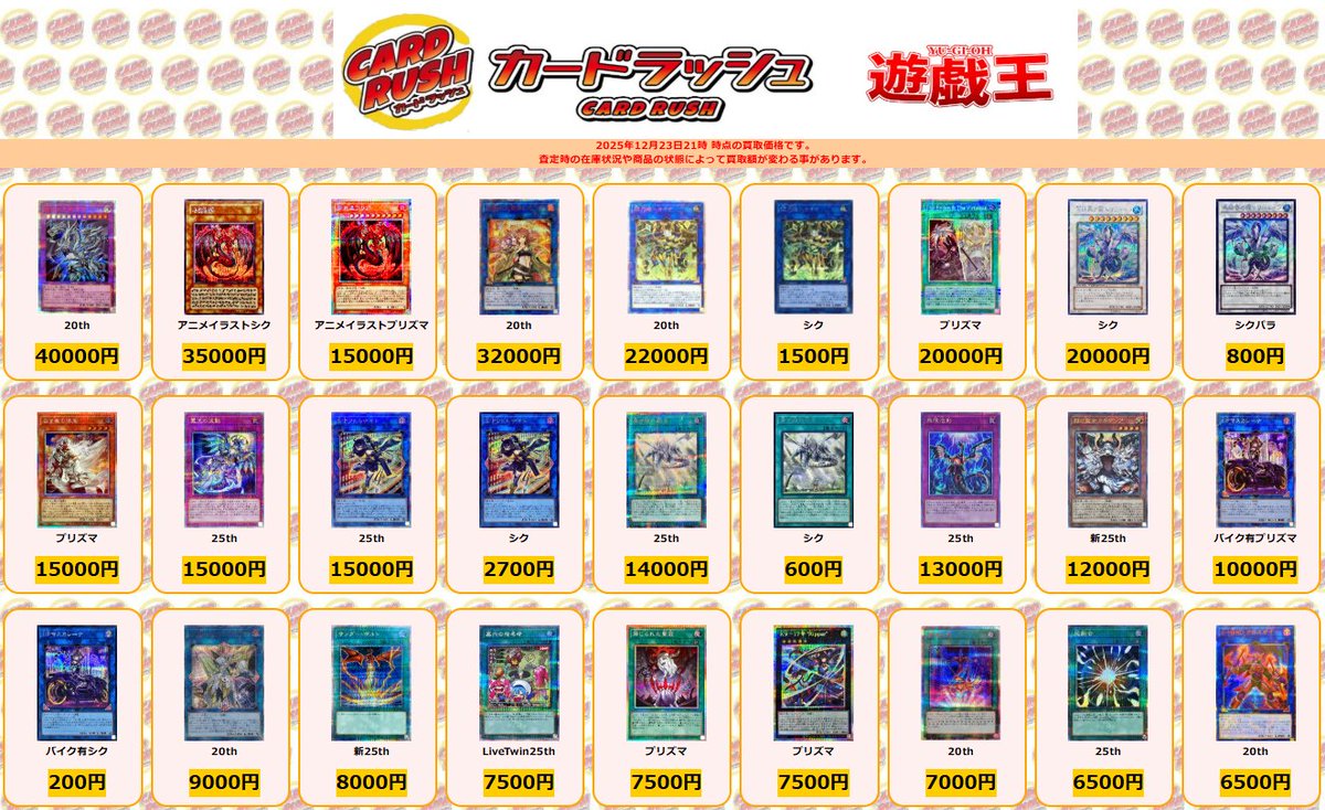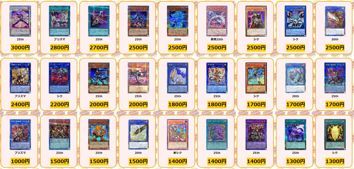 カードラッシュ遊戯王@cardrush_yugioh#遊戯王 買取情報 青眼の究極亜竜 20th ¥40000 神炎皇ウリア(アニメイラスト) シク ¥35000 神炎皇ウリア(アニメイラスト) プリズマ ¥15000 灼熱の火霊使いヒータ 20th ¥32000 閃刀姫カイナ 20th ¥22000 閃刀姫カイナ シク ¥1500 TheFallenTheVirtuous プリズマ ¥20000 氷結界の龍トリシューラ シク ¥20000 氷結界の龍トリシューラ シクパラ ¥800 白き竜の落胤 プリズマ ¥15000 霊王の波動 25th ¥15000 SPリトルナイト 25th ¥15000 SPリトルナイト シク ¥2700 青き眼の祈り 25th ¥14000 青き眼の祈り シク ¥600 無限泡影 25th ¥13000 (新)赫の聖女カルテシア 25th ¥12000 [新]IPマスカレーナ(バイク有) プリズマ ¥10000 [新]IPマスカレーナ(バイク有) シク ¥200 アクセスコードトーカー 20th ¥9000 (新)サンダーボルト 25th ¥8000 [新]墓穴の指名者(LiveTwin) 25th ¥7500 禁じられた聖冠 プリズマ ¥7500 K917号Ripper プリズマ ¥7500 師弟の絆 20th ¥7000 超融合 25th ¥6500 XHEROクロスガイ 20th ¥6500 [新]EvilTwinキスキル(2人/帽子無) プリズマ ¥6500 XHEROクロスガイ 25th ¥1100 [新]閃刀姫レイ(双剣) 25th ¥6000 耀聖の花詩ルキナ プリズマ ¥6000 (新)リミッター解除 25th ¥6000 ネオスフュージョン 20th ¥5500 抹殺の指名者 25th ¥5500 結晶魔術光の涙 赤シク ¥5500 MHEROファーネス プリズマ ¥5200 DHEROディアボリックガイ 25th ¥5000 幻惑の見習い魔術師 25th ¥5000 (新)風霊使いウィン シク ¥5000 精霊獣使いレラ 25th ¥4500 (新)水霊使いエリア シク ¥4500 閃刀術式ベクタードブラスト 20th ¥4500 ティマイオスの眼光 プリズマ ¥4500 カオスアンヘル混沌の双翼 25th ¥4500 赤き竜 25th ¥4500 御巫神舞二貴子 プリズマ ¥4200 白き森のアステーリャ 25th ¥3800 DDスケールサーベイヤー 赤シク ¥3800 LiveTwinキスキル シク ¥3500 (新)調律 25th ¥3500 緊急テレポート プリズマ ¥3500 融合 25th ¥3300 LiveTwinリィラスウィート 25th ¥3200 閃刀姫ロゼ シク ¥3000 ジャンクウォリアー 25th ¥3000 LiveTwinトラブルサン プリズマ ¥2800 エマージェンシーサイバー 25th ¥2700 VHEROヴァイオン 25th ¥2500 マジシャンズソウルズ 25th ¥2500 [新]原始生命態ニビル(悪魔) 25th ¥2500 インフェルニティセイジ シク ¥2500 天羽々斬之巳剣 シク ¥2500 守護竜ピスティ 20th ¥2500 照耀の光霊使いライナ プリズマ ¥2400 閃刀姫アザレア シク ¥2200 EHEROシャドーミスト 25th ¥2000 サイバードラゴンコア 25th ¥2000 聖魔の乙女アルテミス 25th ¥1800 聖霊獣騎レイラウタリ 25th ¥1800 耀聖の波詩ディーナ シク ¥1700 守護竜アガーペイン 20th ¥1700 暗影の闇霊使いダルク 25th ¥1700 暗影の闇霊使いダルク プリズマ ¥1000 DDグリフォン 25th ¥1500 ジャンクシンクロン 25th ¥1500 守護竜エルピィ 20th ¥1500 (新)地霊使いアウス シク ¥1400 強欲で貪欲な壺 25th ¥1400 捕食植物ドラゴスタペリア 25th ¥1400 オノマト連携 25th ¥1300 古の呪文 シク ¥1300 時空の七皇 シク ¥1300 沼地のドロゴン 25th ¥1300 煉獄の消華 シクパラ ¥1200 EHEROサンダージャイアントボルティックサンダー プリズマ ¥1200 ヴァルモニカの神奏ヴァーラル 25th ¥1200 鉄獣式強襲機動兵装改BucephalusII プリズマ ¥1200 鉄獣式強襲機動兵装改BucephalusII シク ¥250 インフェルニティデーモン シク ¥1100 霊獣の継聖 シクパラ ¥1100 神の通告 25th ¥1100 XHEROワンダードライバー 25th ¥1100 EHEROエアーマン 25th ¥1000 EMドクロバットジョーカー 25th ¥1000 マジシャンズロッド 25th ¥1000 大翼のバフォメット 25th ¥1000 絢嵐たるスエン シク ¥1000 白き森のリゼット シク ¥1000 エフェクトヴェーラー ゴルシク ¥1000 Eエマージェンシーコール 25th ¥1000 [新]ライトニングストーム(サイバー) 25th ¥1000 アロマリリスローズマリー 25th ¥1000 インフェルノイドフラッド 25th ¥1000 崔嵬の地霊使いアウス 25th ¥1000 月天気アルシエル プリズマ ¥1000 聖騎士の追想イゾルデ 青シク ¥1000 XHEROヘルデバイサー 25th ¥900 アロマセラフィジャスミン 25th ¥900
