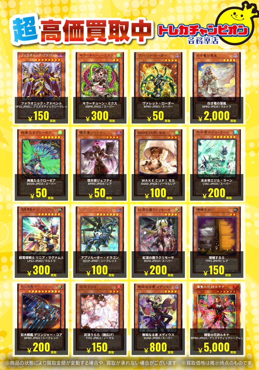 イエローサブマリン 立川店@YS_TACHIKAWA【#遊戯王 買取情報】※立川店限定 無垢なる者メディウス SR¥800 魔を刻むデモンスミス UR¥900 マルチャミー・フワロス R¥1200 M∀LICE<P>White Rabbit SR¥700 封印の魔導士スプーン UR¥600 磁石の戦士Ω+ UR¥500 超電導戦士リニア・マグナム± UR¥400 軒轅の相剣師 N-PL¥300 pic.x.com/GNAy58Ob5C