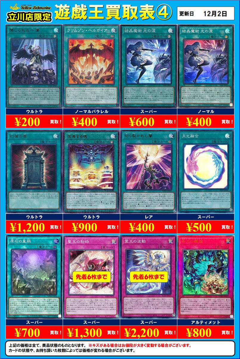 イエローサブマリン 立川店@YS_TACHIKAWA禁じられた一滴 UR¥200 クリムゾン・ヘルガイア N-PL¥400 結晶魔術 光の涙 SR¥600、N¥400 聖王の粉砕 SR¥1300(先着6枚まで) 霊王の波動 SR¥2200(先着6枚まで) 命王の螺旋 ULR¥800 pic.x.com/8uO0VPy46y