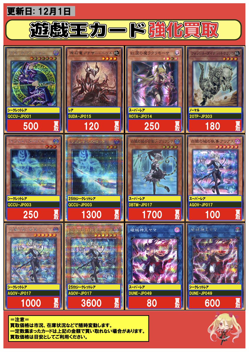 竜のしっぽ布施店@ryuunoshippo_5【高価買取情報】 #遊戯王 #布施しっぽ遊戯王買取表 魔を刻むデモンスミス(ウルトラ) ¥650 白き森の聖徒リゼット(スーパー) ¥450 月女神の鏃(ウルトラ) ¥700 ソード・ライゼオル(スーパー) ¥100 原石の皇脈(スーパー) ¥400 M∀LICE IN UNDERGROUND(スーパー) ¥500 リングリボー(高価N) ¥100 深淵の獣 マグナムート(高価) ¥300 レスキューキャット(高価N) ¥150 数量限定・美品での買取価格となります