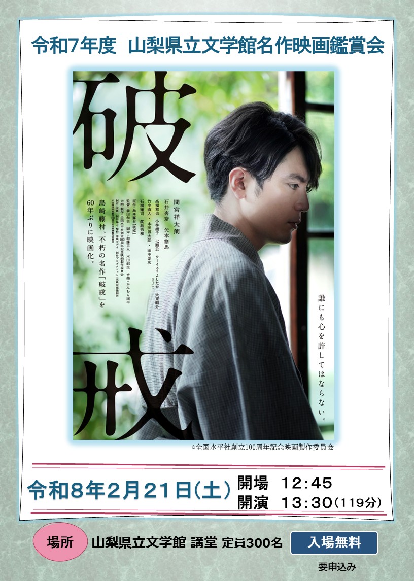 山梨県立文学館@bungakukan_ymns【関連展示のお知らせ】2/21(土)に上映する「破戒」の原作者・島崎藤村の資料を同日から常設展示室で展示します。展示資料は山梨出身の文学者・中村星湖(せいこ)と前田晁(あきら)それぞれに宛てた直筆の手紙です。映画と併せてご覧ください(映画は無料で申込。展示観覧には常設展観覧料が必要)。 pic.x.com/BXtqMTUKEl