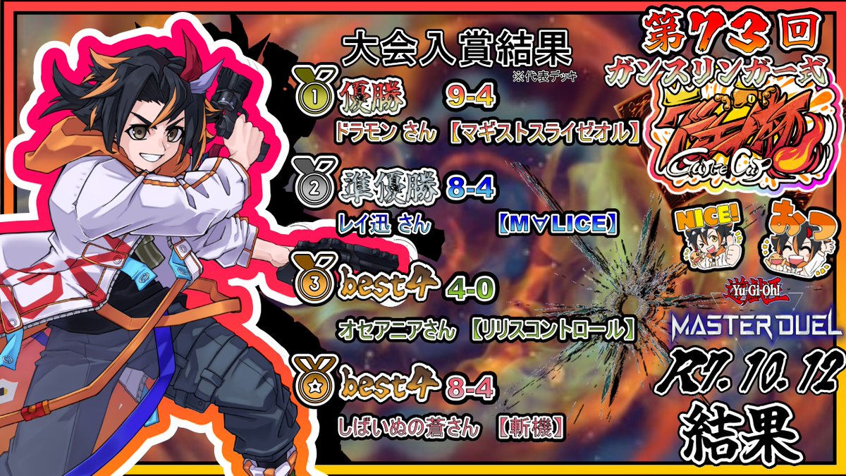 ヴィサス顔GCS(2025/10/12, 21人) 使用 マギストスライゼオル 1R vs M∀LICE 後攻 ●○○ 2R vs デモンスミス巳剣 先攻 ○●● 3R vs 恐竜 先攻 ○●● 4R vs デモンスミス破械 先攻 ○●● 5R vs ティアラメンツ烙印 先攻 ○●○