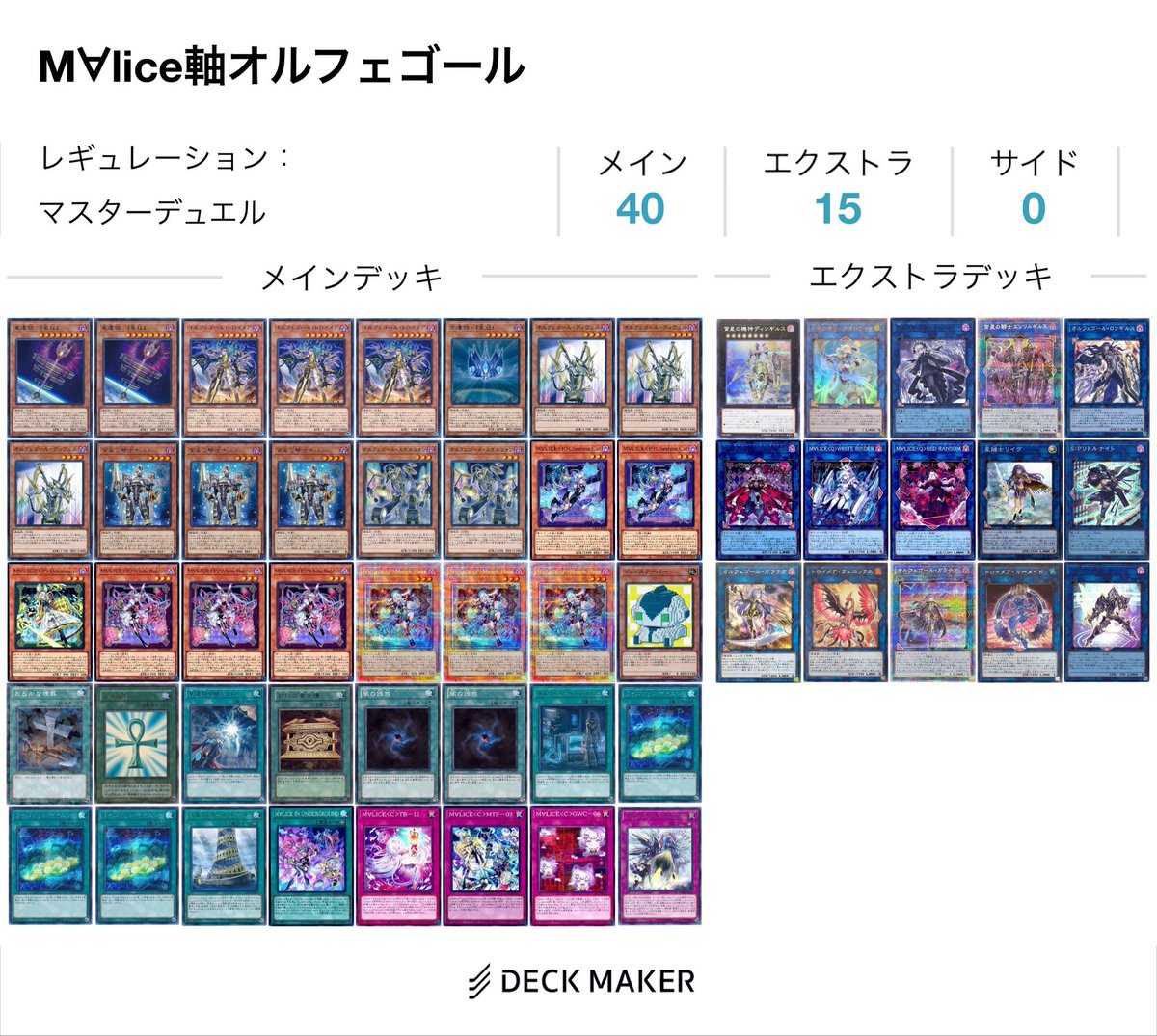 10/12のルムマで使ったM∀lice軸オルフェです、!M∀liceの動きとオルフェの動きを無理やり合体させたシンプルなデッキです、!ほとんどのモンスターが初動になるので事故は少ないよ〜誘発が入ると話は変わるけどね〜 #ホルレシピィ pic.x.com/OmmsqX5a8I