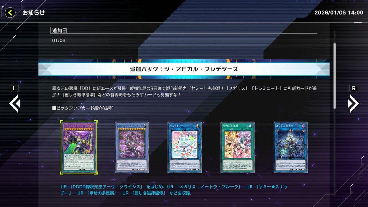 追加日:1/8(木) 異次元の悪魔「DD」に新エースが登場! 縦横無尽のS召喚で戦う新勢力「ヤミー」も参戦! 「メガリス」「ドレミコード」にも新カードが追加! 「麗しき磁律機壊」などの新戦略をもたらすカードも見逃すな!