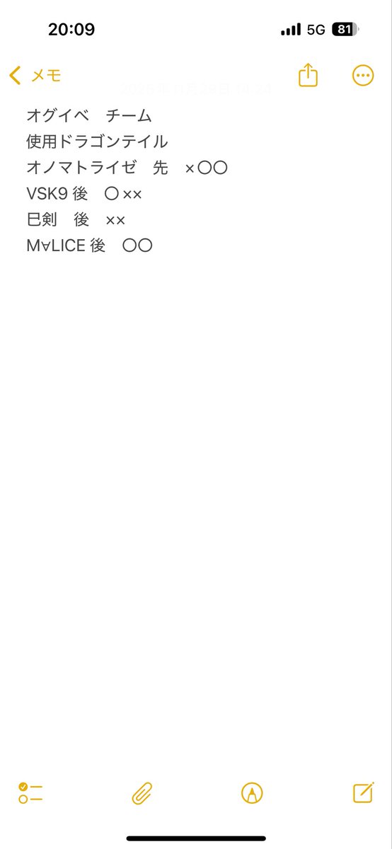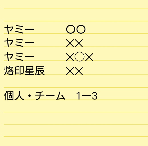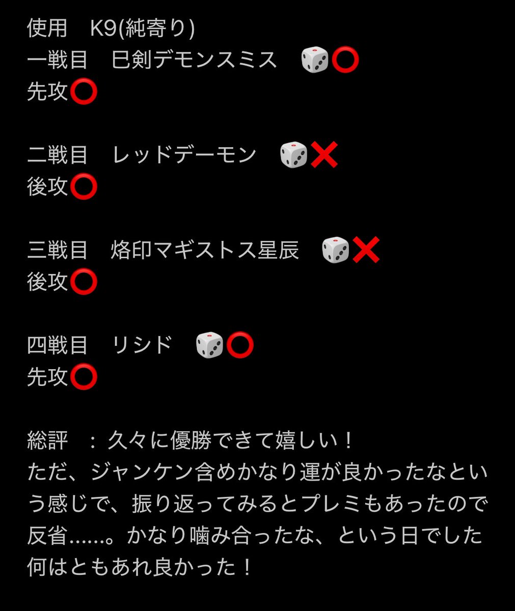 まっち@__129503__11/29 帝龍杯 使用:ヤミー 1.K9アザミナ◯ 2.烙印テイル× 3.K9VS◯ 4.オノマトライゼ◯ 5.マリス◯ 6.烙印テイル× チーム予選全勝 トナメ 1.シード 準決.ヤミー× シード込み個人5-3チーム7-1ベスト4! テイル不利過ぎるのと負けパターンが毎回同じでしんどかった… チーム組んでくれて感謝