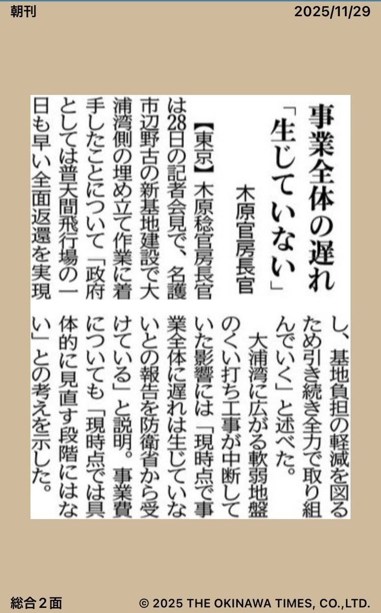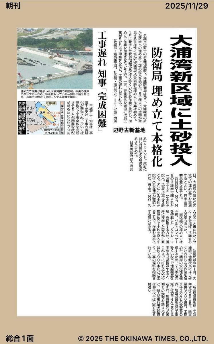 辺野古ぶるー@henoko_sea2025/11/29 海上行動 船一隻、カヌー6艇 昨日午後3時大浦湾へ土砂が投入された。 今日もK9からN1,2,8護岸を見ると、ダンプが数分おきに土砂を投入している。 5ヶ月振りにサンドコンパクション船も戻った。 18日火曜日三隻、20日木曜日二隻、現在五隻の船が大浦湾に停泊している。 11/29タイムスより pic.x.com/qaHmFSVKVy
